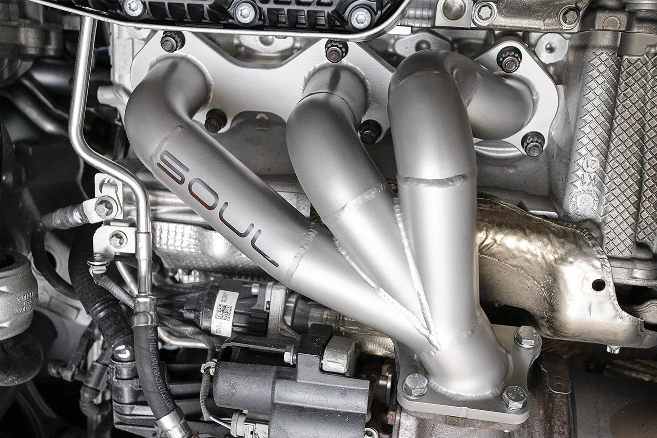 DEVELOPMENT: We sought to maximize performance and boost response knowing that incorporating a merge collector would be particularly beneficial to owners seeking maximum horsepower. Our optimized 3 into 1 merge design improves response over the basic factory design (which lacks a collector), while our equal length 1.75″ runners ultimately increase exhaust velocity into the collector and turbo. The factory outlets are different sized between left and right – 1.4″ and 1.8″ ID respectively – while the SOUL outlet is 2.25″ ID allowing for increased flow and support for big power builds. The internal volume of the header combined with the resulting design improvements pairs well with the efficiency map of the turbo giving you noticeably quicker boost response and more power throughout the RPM range. Pushing the gas pedal down commands faster feedback from the car and each gear has more usable power before a downshift.